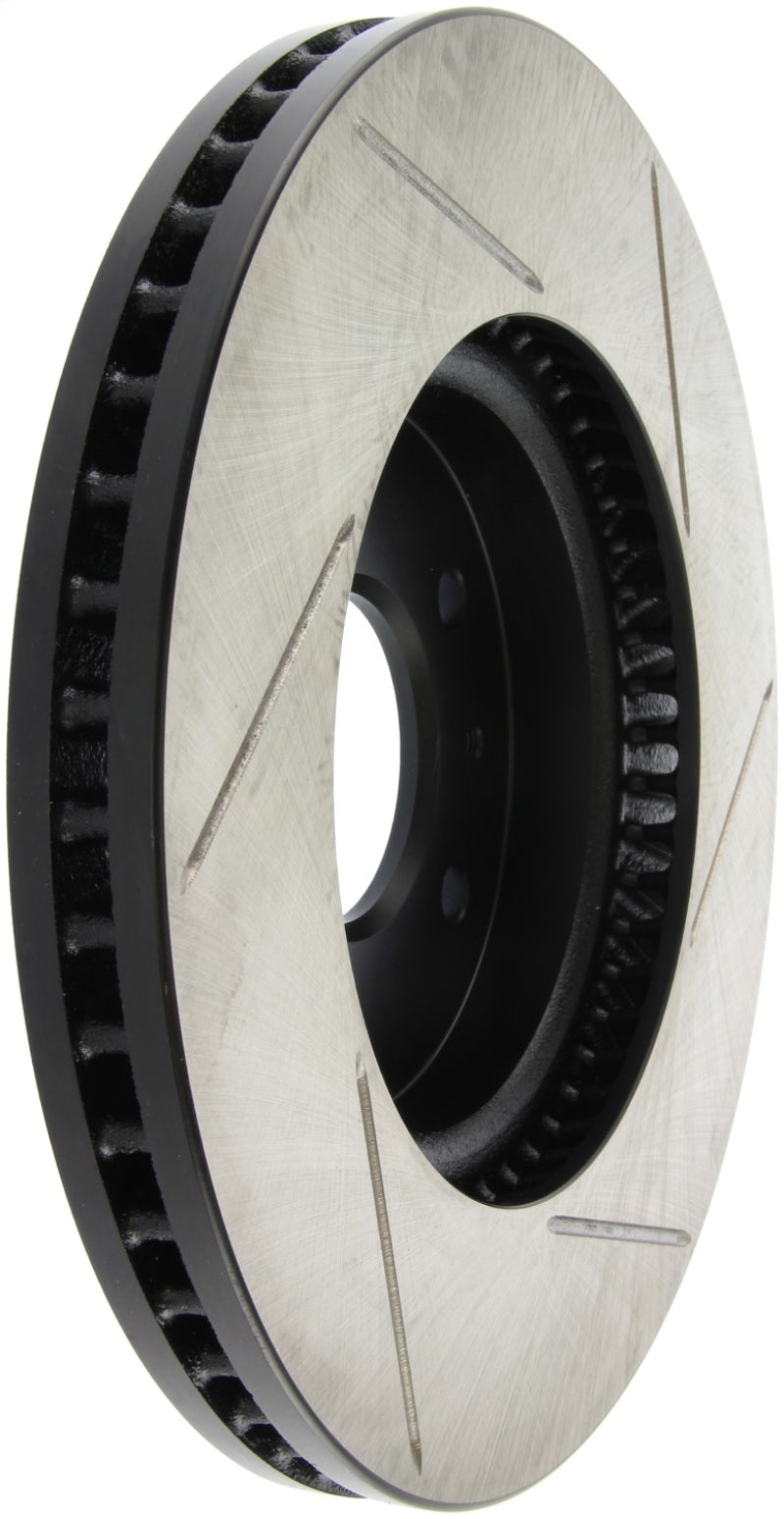 StopTech Slotted Sport Rotors are 1-piece direct replacement brake discs for factory brake systems and stock calipers that look great behind your wheels – and offer significantly improved braking performance. The unique slotting aids with heat and brake dust dispersal, prevents glazing of the pads, adds bite and improves wet and dry braking performance. Built to last, the black e-coating provides protection from corrosion and the high carbon metallurgy (in most applications) offers quieter operation, better crack resistance and increased performance.